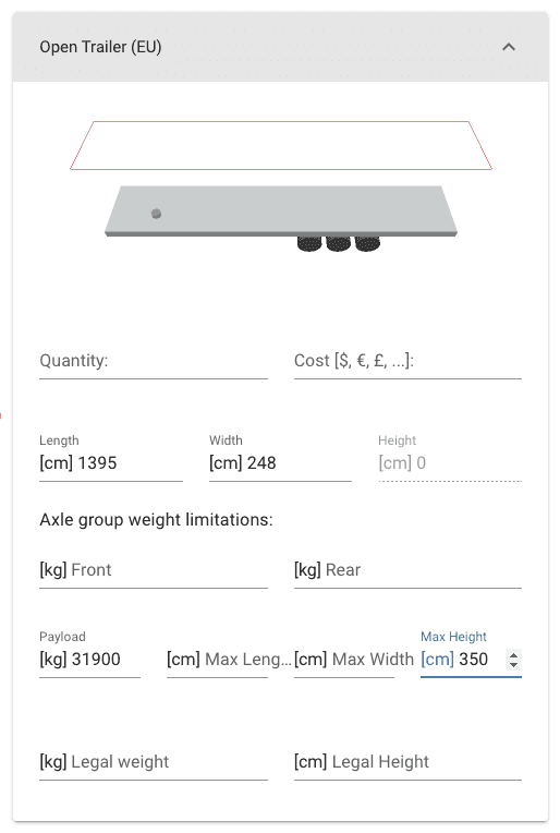 We have picked an Open Trailer and increased the Max Height to 350cm in order to fit the large coil. And that's it. We run Create and calculate to see our results.